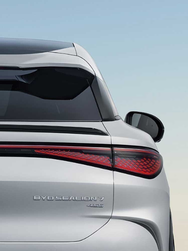 Desain lampu belakang BYD Sealion 7 menonjolkan gaya futuristis dengan garis cahaya ramping dan detail menyerupai tetesan air, menghadirkan efek dinamis yang terinspirasi dari aliran air cepat.
